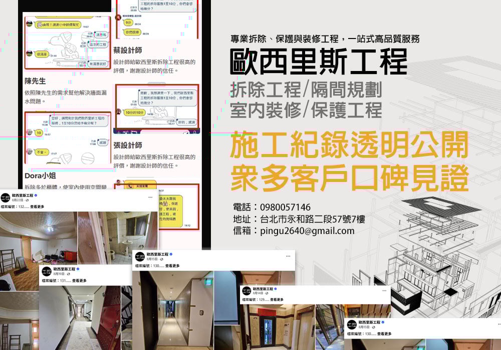 歐西里斯工程不僅是一家施工公司,更是您值得信賴的 空間打造夥伴。透過專業團隊、透明流程、多元服務與口碑見證,持續成為拆除、裝修與保護工程的最佳選擇。歐西里斯工程聯絡資訊
