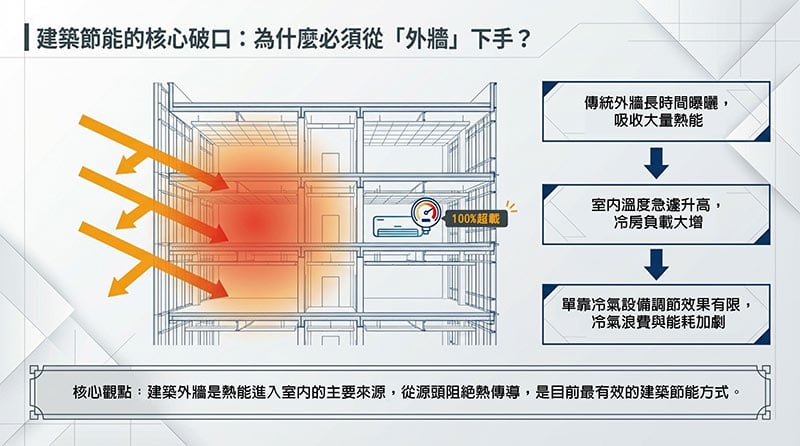 因為建築外牆是熱能進入室內的主要來源,控制外牆就等於控制冷氣需求。傳統建築問題: