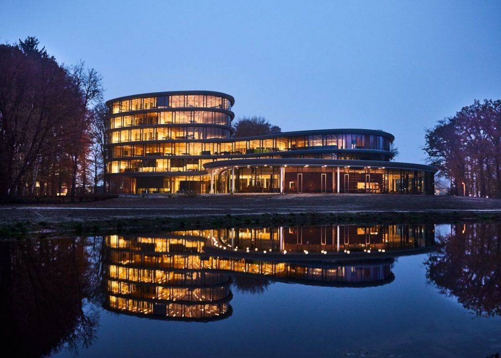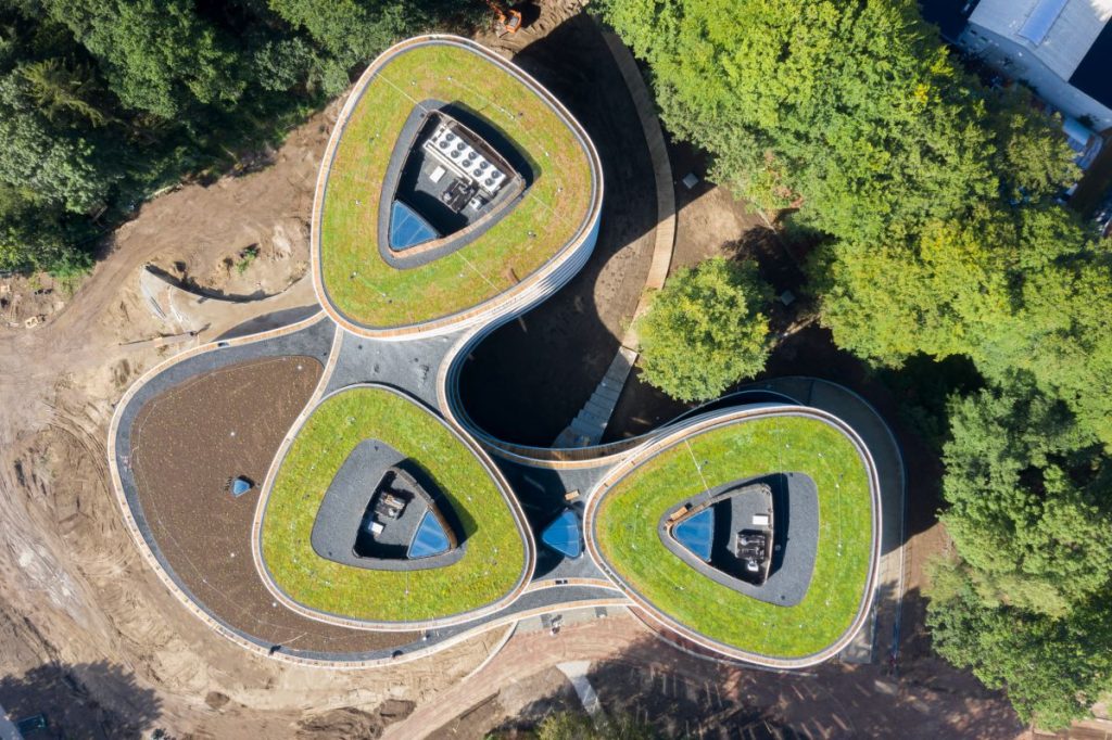可彎曲的木質建材形成柔和無稜角的的圓弧造型,並擴延出有機形式。五層樓高的建築組成與形貌受到自然景觀、周遭莊園景觀室及蝙蝠飛行軌跡的啟發,在玻璃立面的通透反射下,更顯其與環境的無間距離與永恆對話性。建築順著外圍的綠林輪廓創建三個半封閉的室外空間,並使得三座塔樓相互連接。