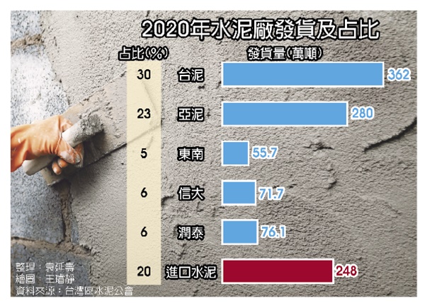 台灣區水泥公會統計,目前國內水泥市場每年供給量約在1150萬噸上下,主要生產水泥廠以台泥、亞泥、信大水泥為主,國內水泥廠的產量約占市場的八成、國外進口水泥則占20%。
