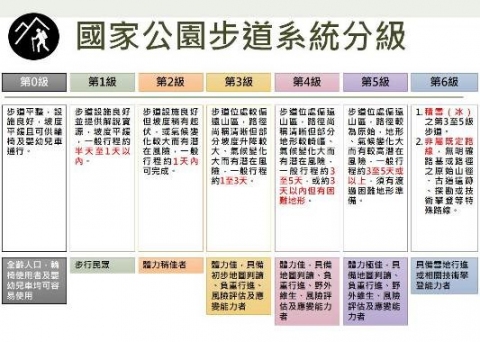 營建署說明國家公園步道系統之分級內容,0級為適合全齡人口,可供輪椅及嬰幼兒車使用;1至2級為1日內可完成,且設施良好步道。3至5級以上則屬較偏遠之山區,建議民眾應具備地圖判讀、負重行進、風險評估及應變能力;第6級則為積雪(冰)之第3至5級之步道或非屬既定路線,民眾欲前往時,至少需具備雪地行進或相關技術攀登能力。