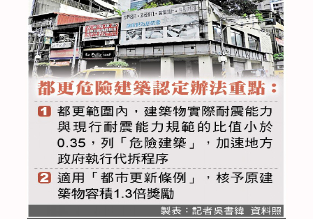 為提升國人居住安全,內政部11月4日於部務會報通過「都市更新耐震能力不足建築物而有明顯危害公共安全認定辦法」,明定都更範圍內,若經評估建築物耐震能力未達現行規範三分之一,視為耐震能力不足且有傾倒危害公安疑慮。此舉有助地方政府判定危險建築,加速執行代為拆除程序,同時作為核予原建築容積1.3倍獎勵的依據,加速都市危險建築更新。