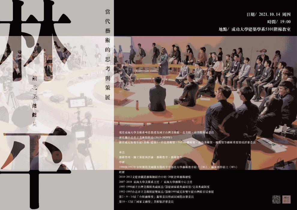 【成大建築講堂—秋。第一場】2020年剛卸任北美館館長一職的林平教授將與我們分享除了在國內外合作策展經驗中的所見所聞以及有關藝術創作等相關經歷,亦談及如何藉由融入藝術於日常,改變建築、空間與生活的狀態並從當代藝術的角度切入淺談人、藝術、建築三者密切的互動關係。