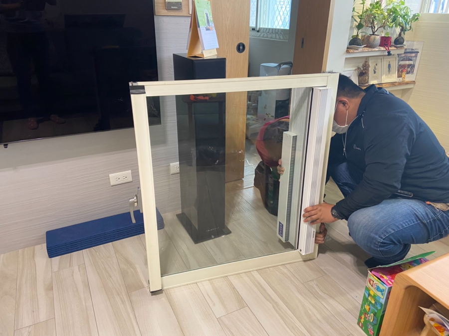 客戶原本已在家中換裝過吊頂式的全熱交換器,然而長期在家中歡聚節慶,發現只要人多,二氧化碳濃度還是高、氧氣不夠用,為了給小孩及朋友們更好的環境,決定使用Obooter窗型全熱交換器,安裝快速方便,免洗孔、免穿牆,能通風換氣,且機器運轉的聲音也安靜,客廳安裝完畢時,美觀的外表也讓客戶很驚艷。
